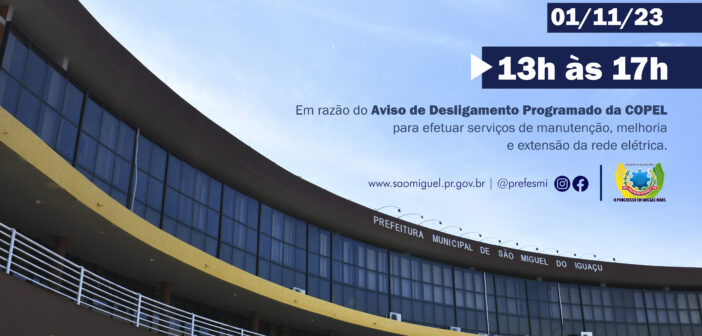 O Governo Municipal de São Miguel do Iguaçu informa que nesta quarta-feira, 01 de novembro, o atendimento no Paço Municipal Abel Bez Batti será realizado somente no período da tarde, conforme o Decreto nº 639/2023, publicado no Diário Oficial Eletrônico de segunda-feira, 30.