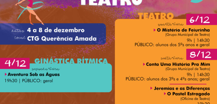 A abertura da Mostra Municipal será na segunda-feira, 04 de dezembro, a partir das 19h30, com a apresentação “Aventura Sob as Águas”, da Ginástica Rítmica do município, aberta para toda a comunidade.