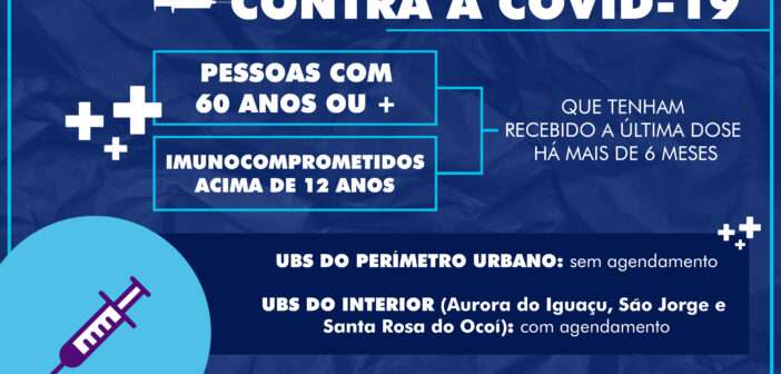A imunização com segunda dose de reforço da vacina bivalente está disponível em todas as Unidades Básicas de Saúde do perímetro urbano (não sendo necessário o agendamento) e nas unidades do interior (Aurora do Iguaçu, São Jorge e Santa Rosa do Ocoí) com agendamento.
